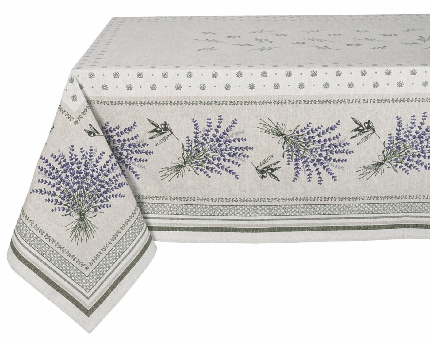 Austa žakardo būdu, ši staltiesė dekoruota švelniais levandų šakelių motyvais ir subtiliais ornamentiniais raštais, kurie į interjerą įneša lengvumo, ramybės ir pietietiško žavesio. Natūrali, šviesi audinio spalva harmoningai dera su violetiniais ir žalsvais akcentais, o dekoratyvinės juostos bei klasikiniai kraštų raštai sukuria tvarkingą ir estetišką visumą.