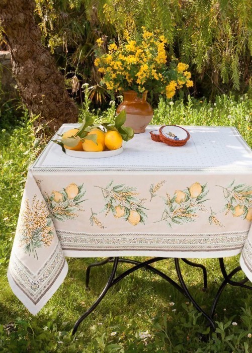 Staltiesė austa žakardo būdu, dekoruota subtiliais citrinų ir žaliuojančių šakelių raštais, kurie įneša į interjerą lengvumo ir pietietiškos nuotaikos. Šviesus fonas ir harmoningos detalės sukuria švarią, estetišką visumą. Kasdienybėje ji – tikras džiaugsmas: audinys malonus liesti, gražiai krinta, mažai glamžosi ir yra lengvai prižiūrimas. Tvirta audimo technika užtikrina ilgalaikį rašto išlaikymą ir kokybę.
