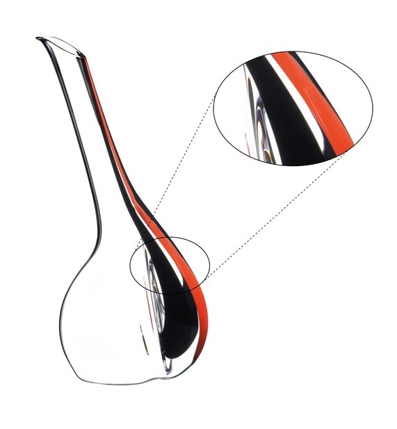 The handmade “RIEDEL Touch” decanter stands out with its unexpected, seemingly gravity-defying shape. An asymmetrical, curved base flows into an elegantly angled neck, while a subtle glass ridge functions as an integrated handle, ensuring a comfortable and secure grip when pouring.