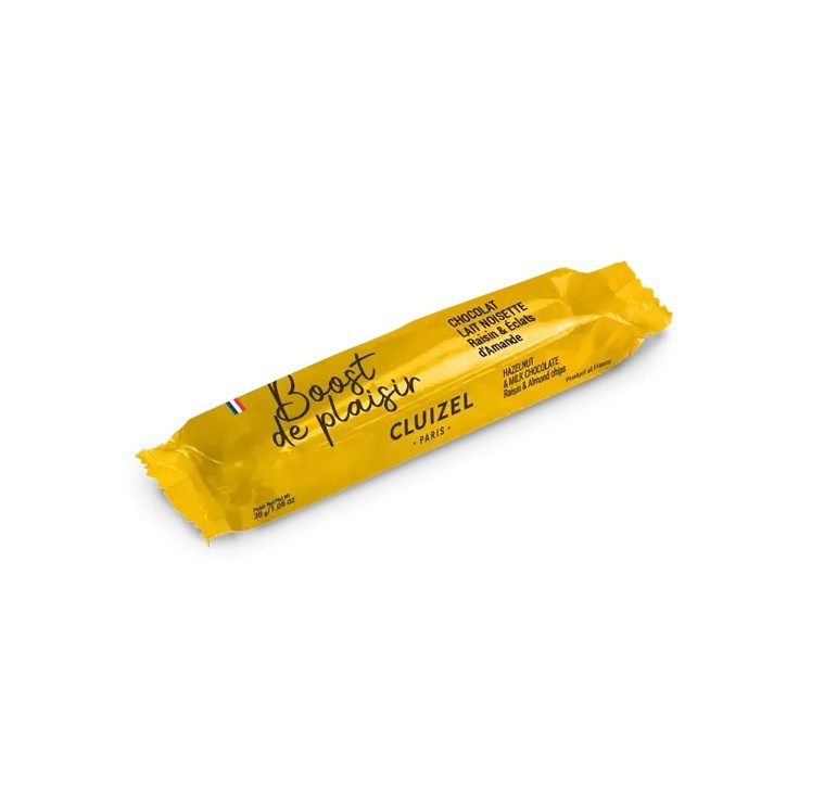 Michel Cluizel pieniško šokolado (45 %) batonėlis su razinų, migdolų ir laždyno riešutų kremu.