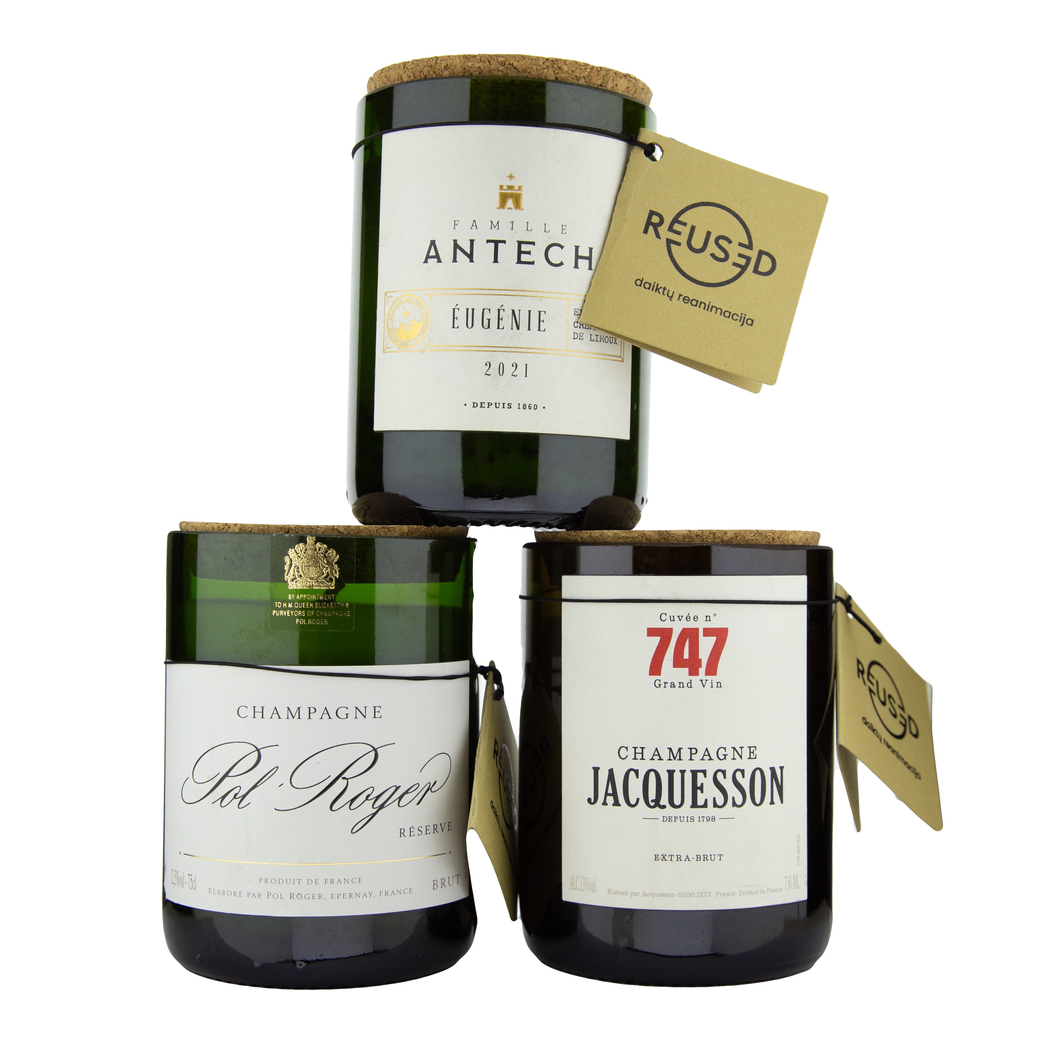 REUSED items are born from glass bottles that have already served their original purpose. These bottles – from champagne to wine – are creatively repurposed into handcrafted candle holders and stylish interior accents. In doing so, REUSED helps reduce waste and promotes conscious living.