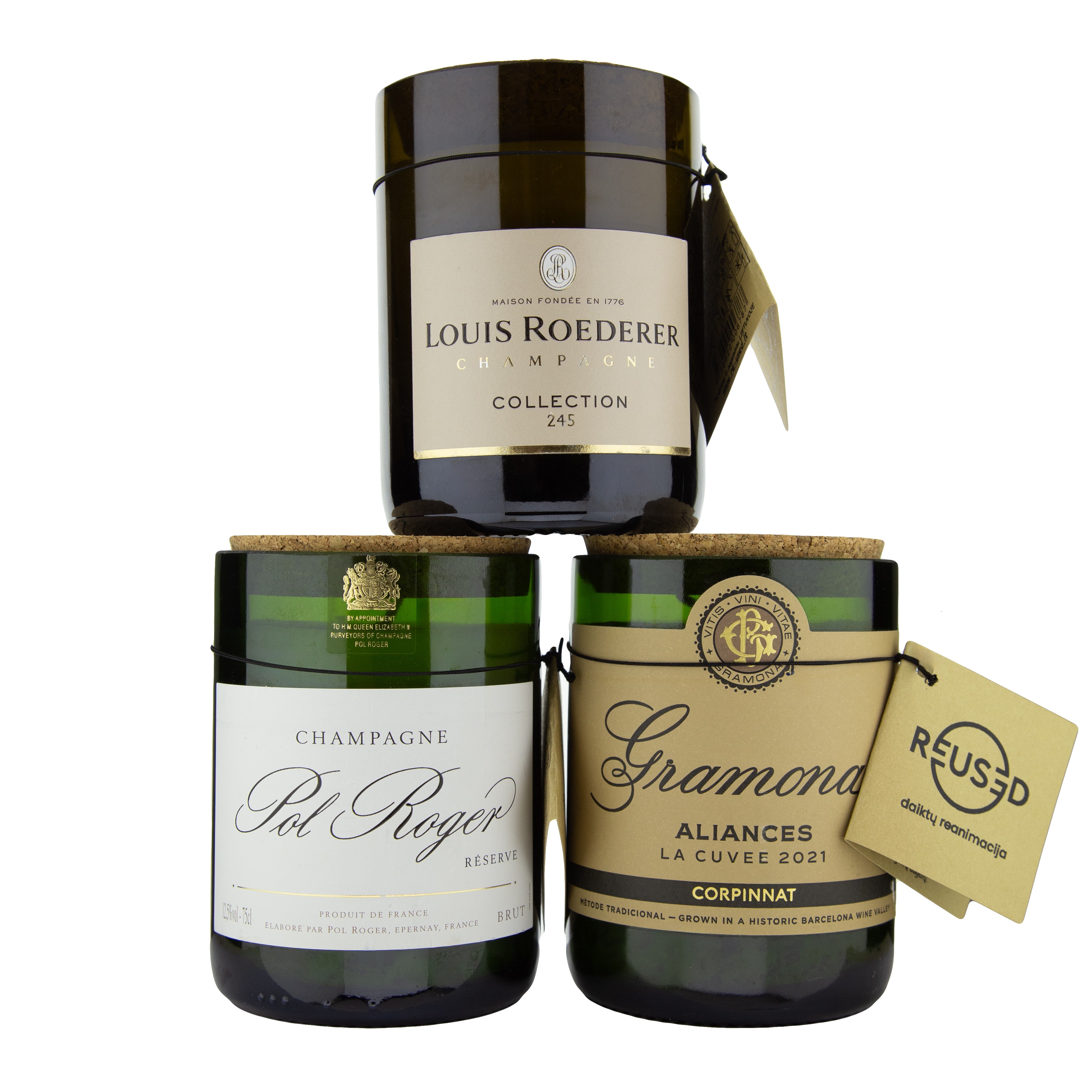 REUSED items are born from glass bottles that have already served their original purpose. These bottles – from champagne to wine – are creatively repurposed into handcrafted candle holders and stylish interior accents. In doing so, REUSED helps reduce waste and promotes conscious living.