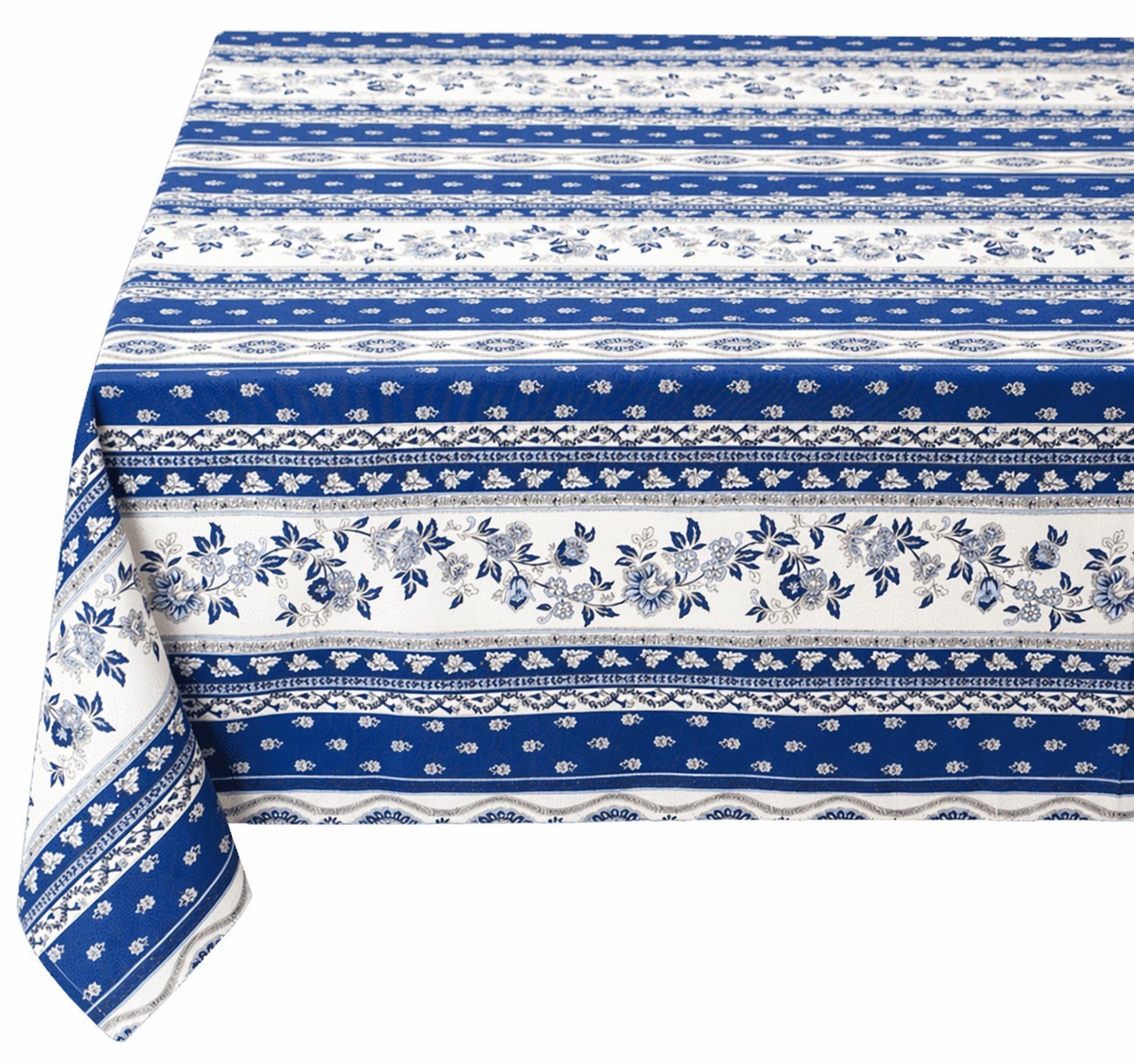 The tablecloth is decorated with horizontal bands of blue ornamental and floral patterns, creating a neat, decorative, and visually complete look. The white background and rich blue accents bring freshness, cleanliness, and a touch of classic elegance to your interior. This combination of patterns is perfectly suited for both everyday use and more cozy or festive table settings.