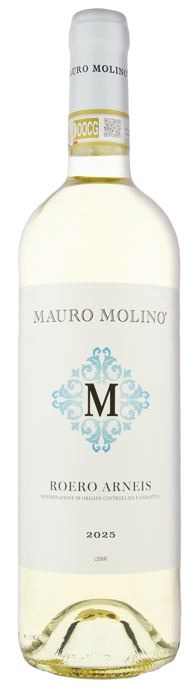 Mauro Molino Roero Arneis 2025 – tai elegantiškas, aromatingas, gaivios stilistikos Pjemonto baltasis vynas iš Roero Arneis DOCG, gaminamas iš 100% ‘Arneis’. Mauro Molino vyninė šį vyną kuria iš smėlingų dirvožemių vynuogynų su pietryčių ekspozicija; derlius paprastai renkamas anksti rugsėjį, o pats vynas fermentuojamas ir brandinamas plieno talpose, siekiant išlaikyti veislės švarą ir tikslų vaisiškumą.