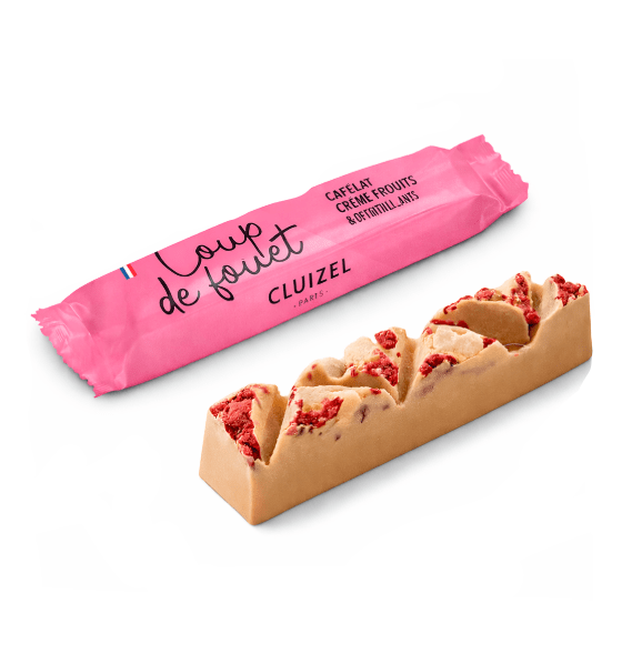 Michel Cluizel baltojo šokolado (min. kakavos 33 %) batonėlis su džiovintomis citrinomis, avietėmis, bananais, pagardinta lazdynų riešutų kremu.