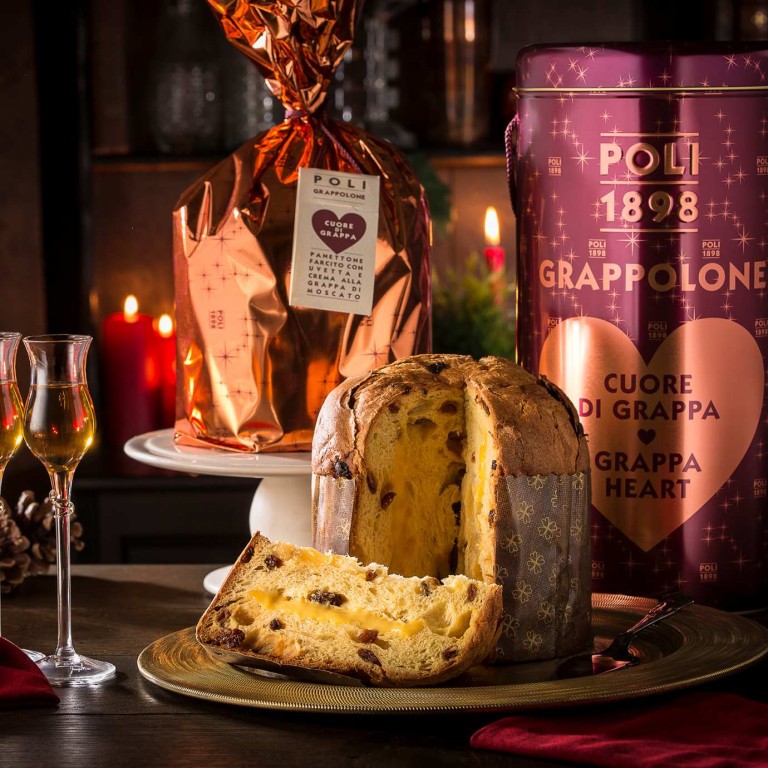 Garsiosios „Poli“ grapos virtuozo Jacopo Poli'o ir konditerio Dario bendras kūrinys. Panetonė su grapa – tradicinis italų kalėdinis pyragas kepamas vieną kartą per metus. „Panettone“ įdaryta razinomis, muskatiniu vynu bei pagardinta kremu su grapa. Šis pyragas itin minkštas, drėgnos bei purios struktūros. Įdaras jam suteikia subtilaus deserto akcentų, kuris lengvai taps tikra kalėdinio stalo puošmena. Jis supakuotas į įspūdingą metalinę cilindro formos dėžutę, tai puiki kalėdinė dovana verslo partneriams ar šeimos nariams.